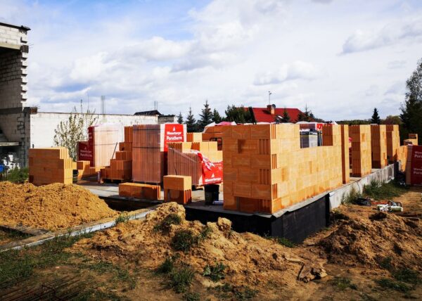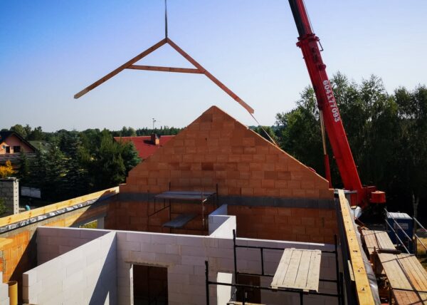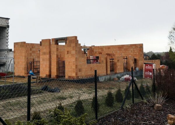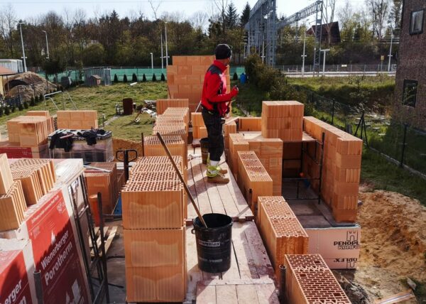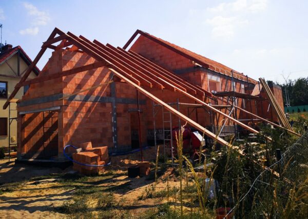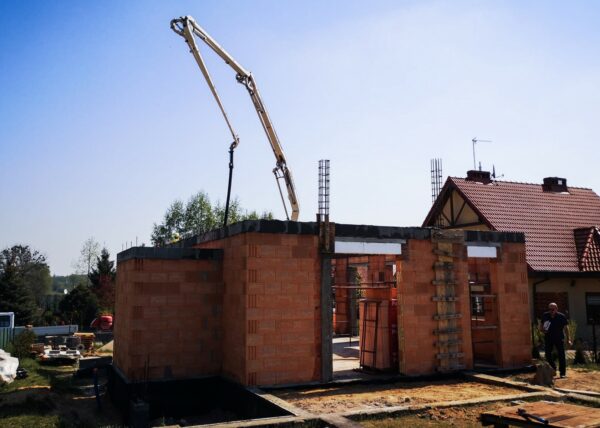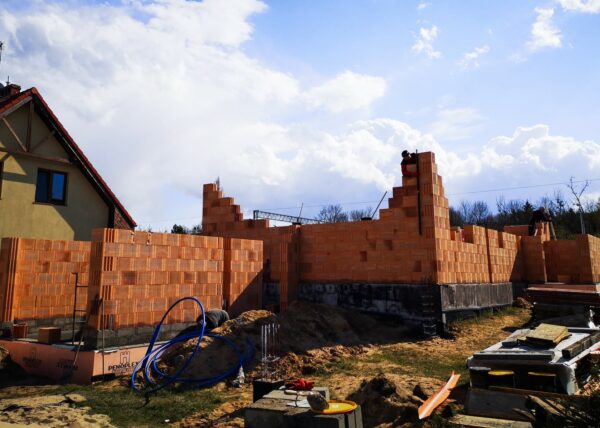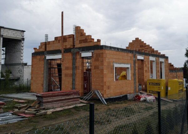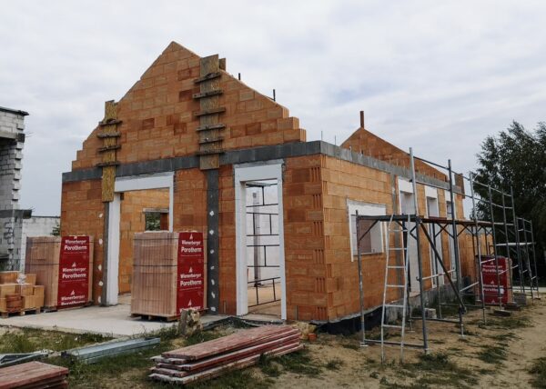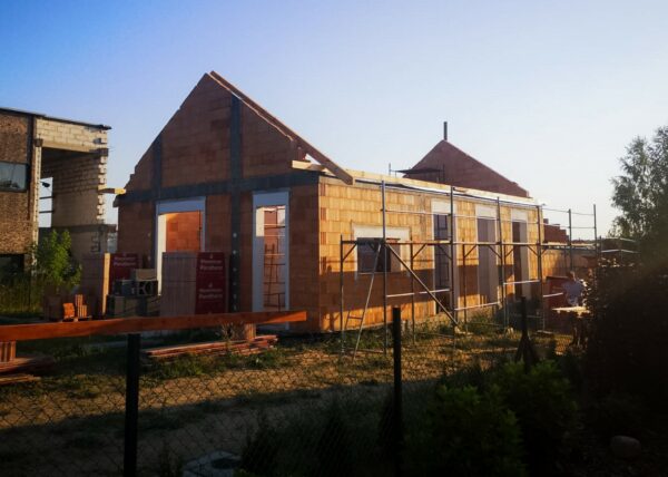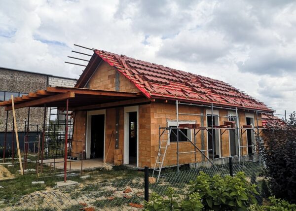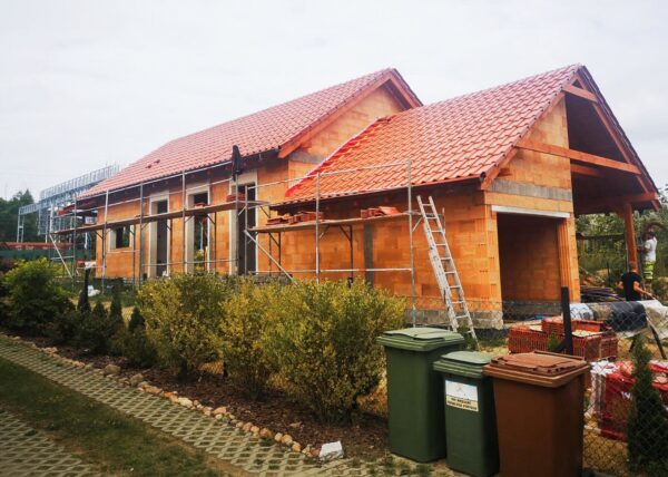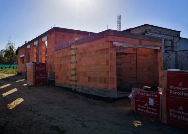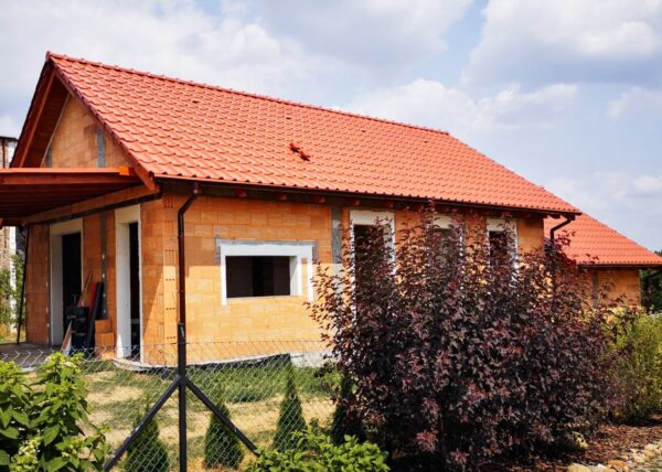 Stworzyliśmy kanalizę podposadzkową oraz przyłącze do sieci kanalizacyjnej. Mury powstały z zeszlifowanego pustaka ceramicznego w technologii DRYFIX firmy WINEBERGER - klejone na pianę pistoletową. Budynek nie posiada stropu, a dach jest dwuspadowy. Część garażowa i wiata oddzielona od części mieszkalnej. Konstrukcja dachu krokwiowo-jętkowa, pokrycie dachowe - dachówka ceramiczna firmy WINEBERGER Koramic Alegra 9.