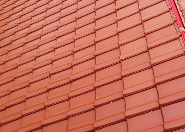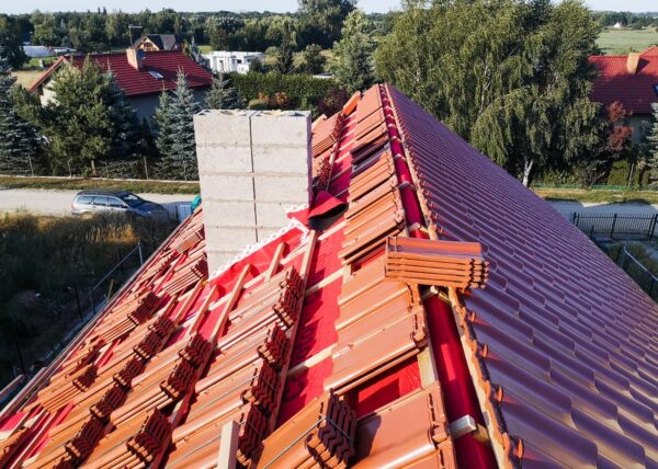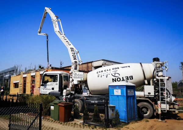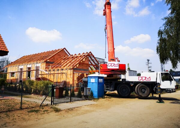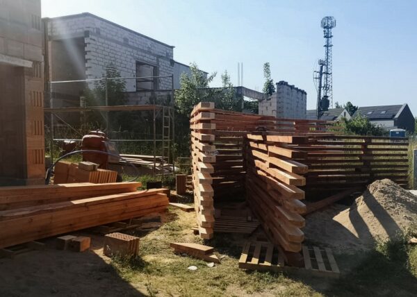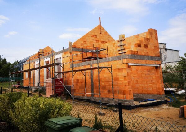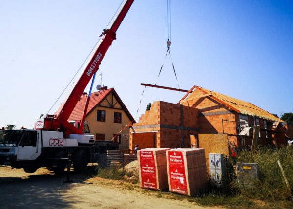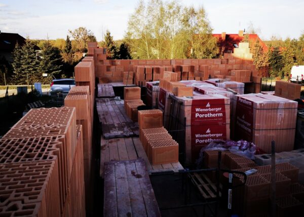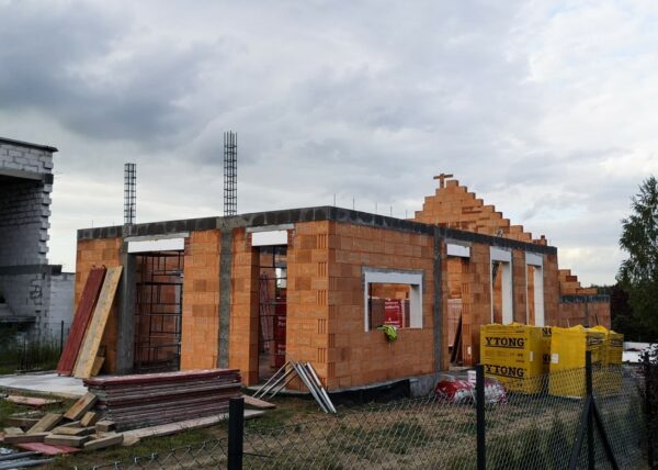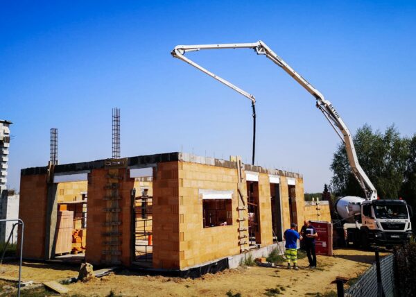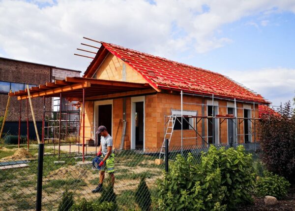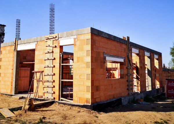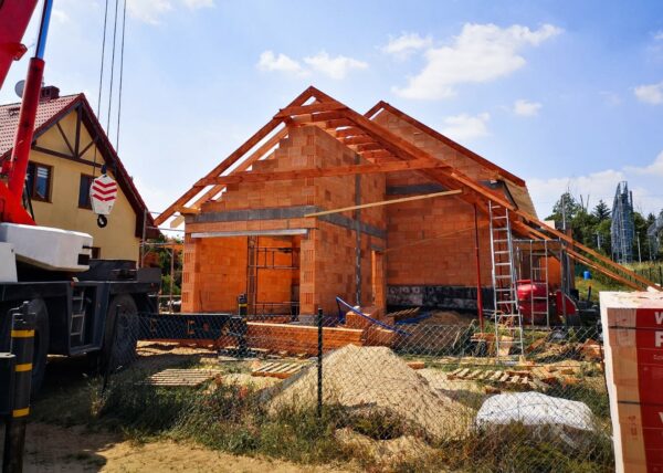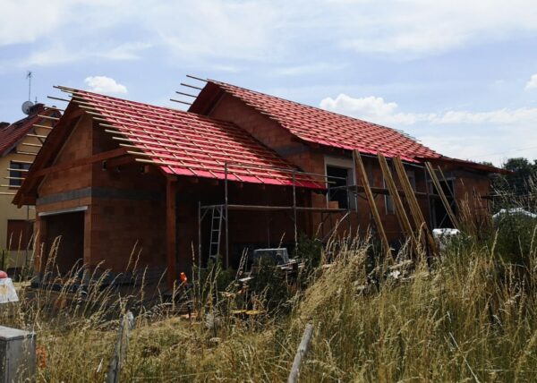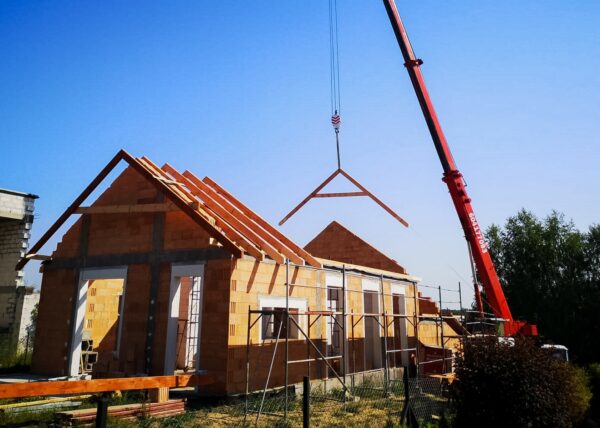 Stworzyliśmy kanalizę podposadzkową oraz przyłącze do sieci kanalizacyjnej. Mury powstały z zeszlifowanego pustaka ceramicznego w technologii DRYFIX firmy WINEBERGER - klejone na pianę pistoletową. Budynek nie posiada stropu, a dach jest dwuspadowy. Część garażowa i wiata oddzielona od części mieszkalnej. Konstrukcja dachu krokwiowo-jętkowa, pokrycie dachowe - dachówka ceramiczna firmy WINEBERGER Koramic Alegra 9.