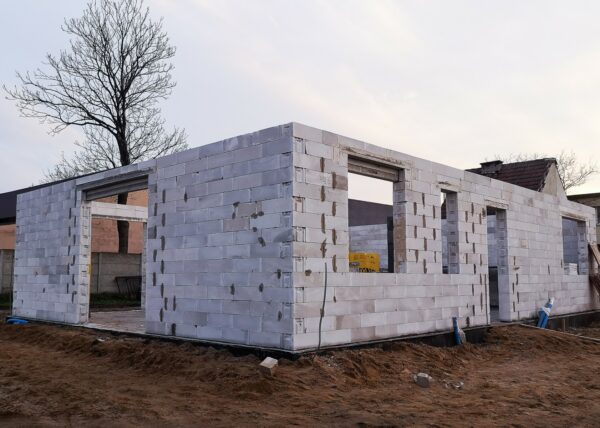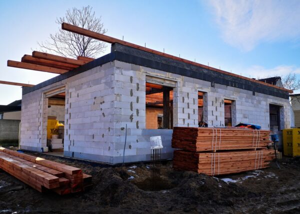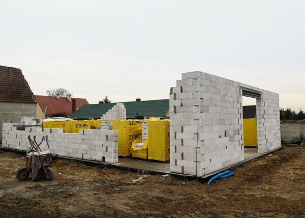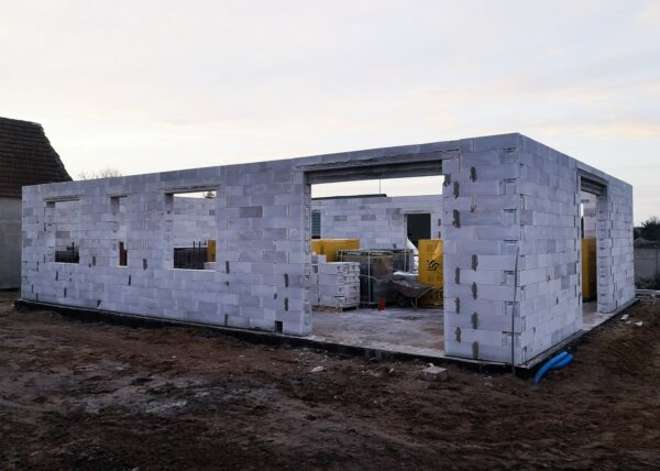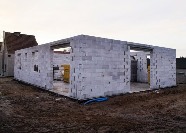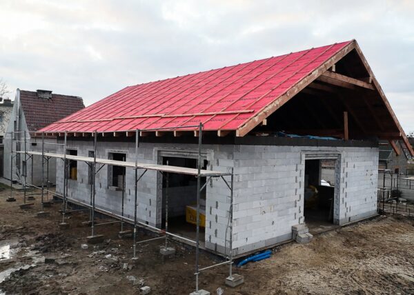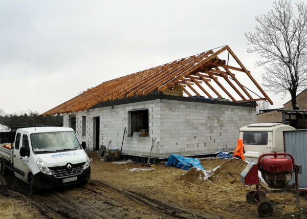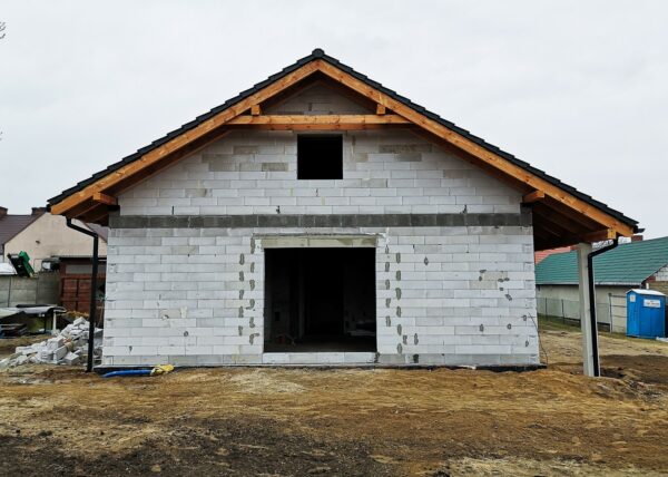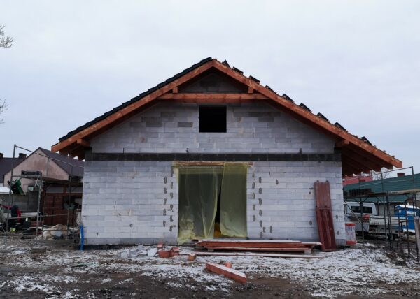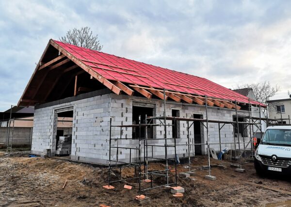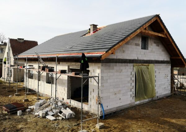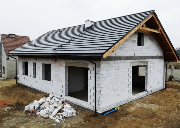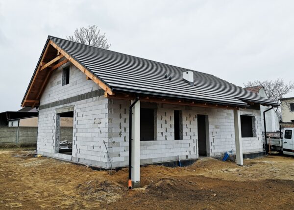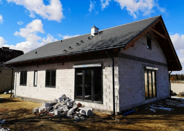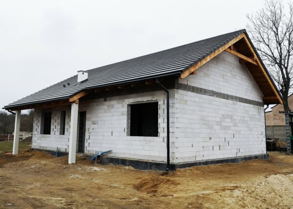 Dom, który powstał jest parterowy (poddasze nieużytkowe), został zaprojektowany (u Architekta) na bazie prostokąta, ma dwuspadowy dach. Murowany z gazobetonu, strop drewniany. Konstrukcja dachu krokwiowo-jętkowa, pełne deskowanie. Użyliśmy dachówki Creaton Domino. A system rynnowy to Galeco.