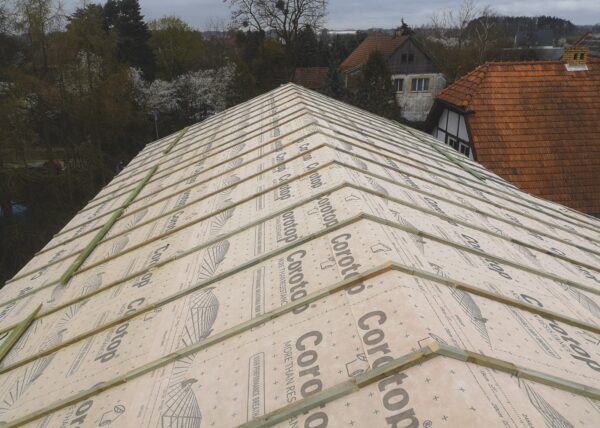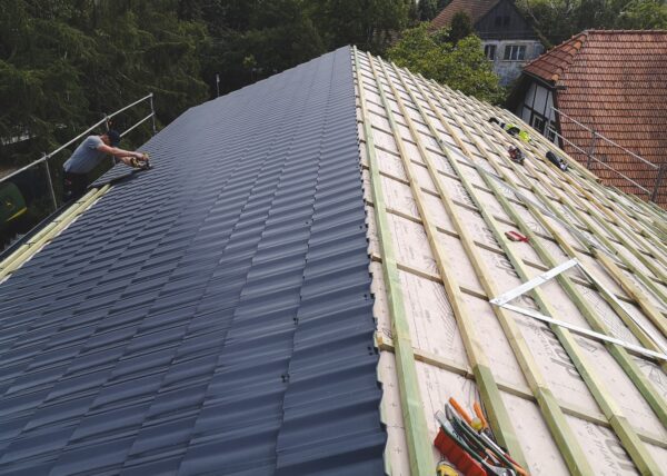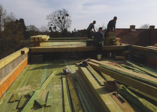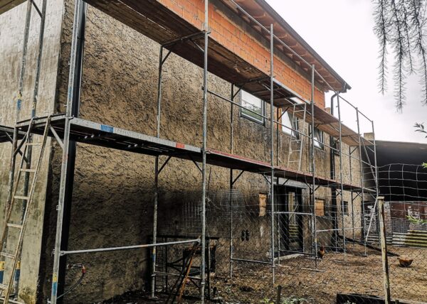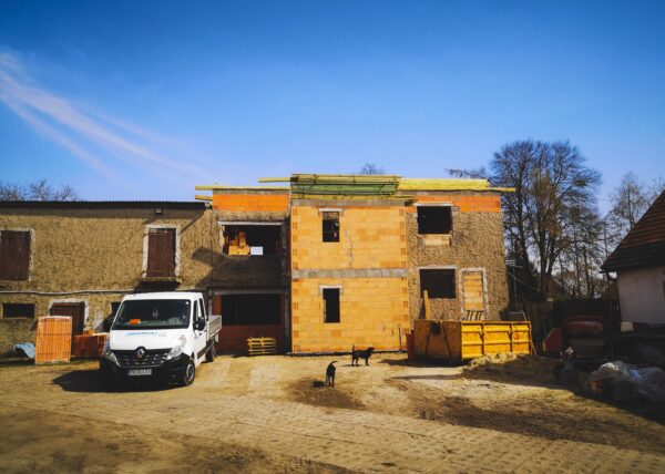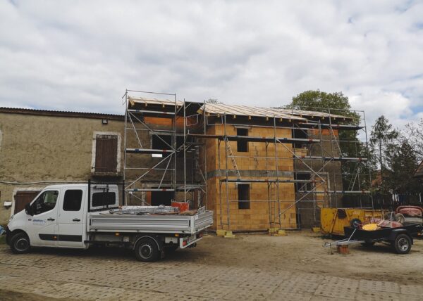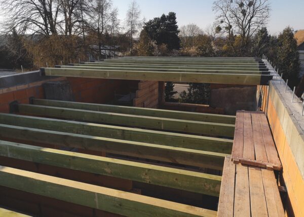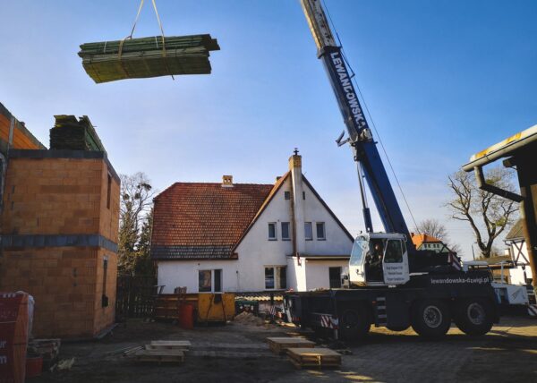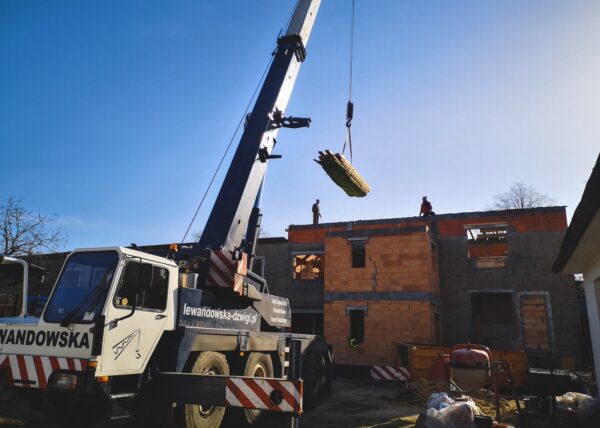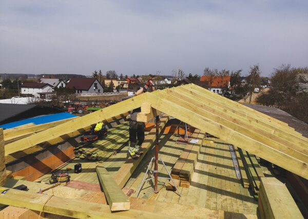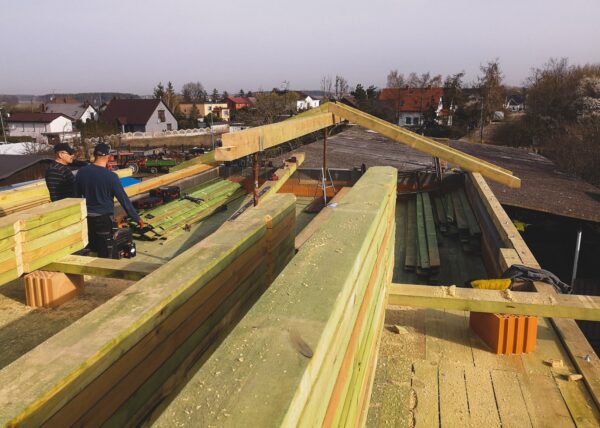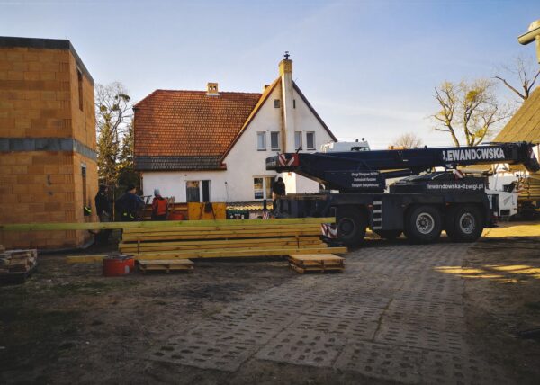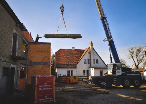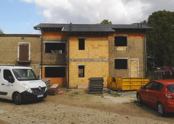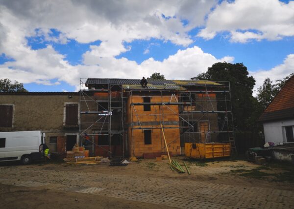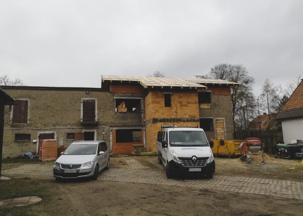 Co zrobiliśmy w ramach przebudowy budynku w Golęczewie? Zdemontowaliśmy dach i podnieśliśmy ściany nośne w budynku. Zamurowaliśmy niepotrzebne "otwory" i wykonaliśmy nowe, w istotnych miejscach. Dobudowaliśmy dwie łazienki, a także utworzyliśmy wejście od budynku. Wykonaliśmy strop drewniany na pomieszczenia znajdujące się na strychu. Użyliśmy wieźby tradycyjnej-krokwiowej z pełnym deskowaniem. Pokrycie dachu wykonaliśmy z blachodawchówki Blachodach Flamenco.